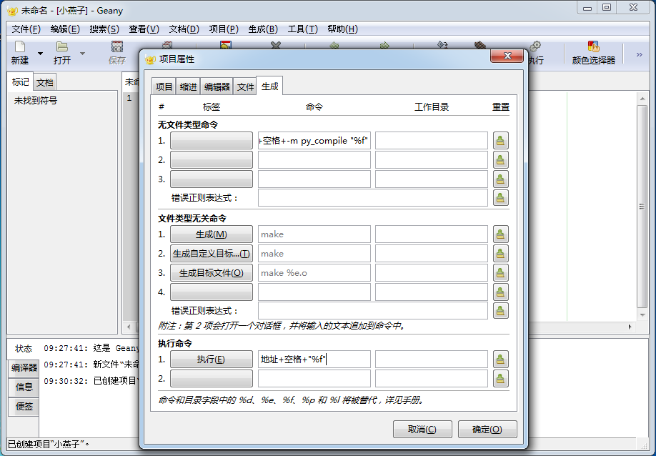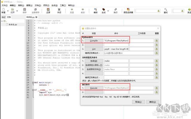 打開Geany,在新建中下拉選擇新建main.py,出現(xiàn)新的界面后選擇生成—設(shè)置生成命令,然后在這個(gè)命令里面修改python命令和執(zhí)行命令,