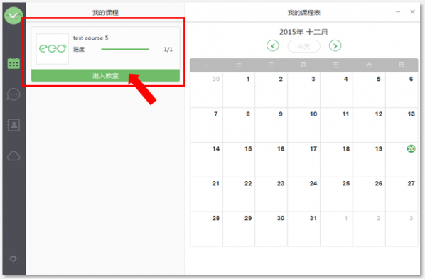 在后臺排好課后,用戶會在ClassIn客戶端看到當天的課程。在課程開始前20分鐘(學生用戶開課前10分鐘可進入教室)。點擊“進入教室”,即可進入教室。