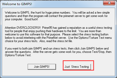 1.將kkx分享更多壓縮包解壓到本地,首次打開軟件Prime95中文版軟件會彈出選擇對話框。在這里選擇“Just Stress Testing”;