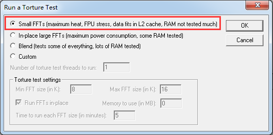 2.然后在選擇第一項,其它設(shè)置保持不變。該項是用于對 CPU 的浮點運算測試,另外還會對 CPU 的緩存進行填充測試。