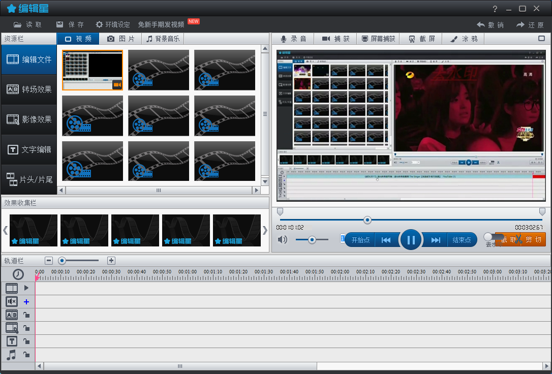 編輯星是一款由北京友維科軟件科技有限公司研發(fā)的視頻編輯軟件產(chǎn)品品牌。它的功能全面的視頻編輯工具,從讀取、特效、剪輯、轉(zhuǎn)場(chǎng)、重疊到字幕、配樂(lè)、錄音一概俱全。內(nèi)置精美視頻素材庫(kù),配置了視頻剪輯、視頻合成、視頻轉(zhuǎn)場(chǎng)、視頻特效、視頻字幕、視頻配音、視頻錄音等全功能,使用編輯星可以幫助大家輕松制作并美化視頻。