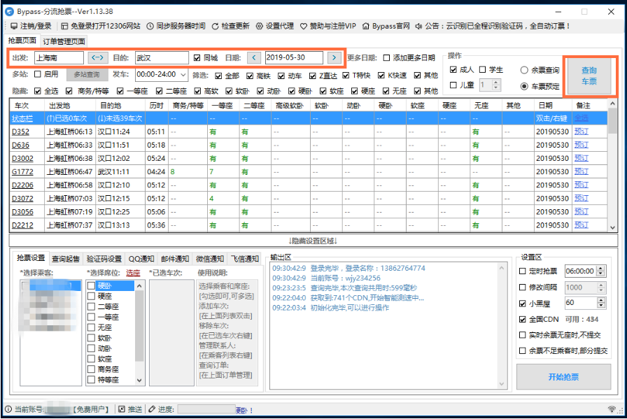 進(jìn)入12306Bypass分流搶票軟件的界面,如圖,輸入出發(fā)地、目的地、出發(fā)時(shí)間、車型等信息,點(diǎn)擊【查詢車票】,