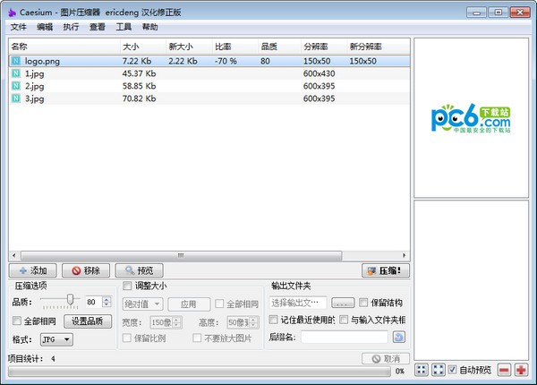 Caesium是一款超好用的壓縮圖片大小的軟件,支持JPG、BMP、PNG、GIF、WMF等常用圖片格式,Caesium 可以在保證圖片原有品質(zhì)的同時,將圖片大小減少90%。如果你在一些地方遇到了有限制上傳圖片的大小的問題,只需使用kkx分享的【Caesium】來進行壓縮圖片即可得到可以符合規(guī)定的圖片,并且在操作的同時還可以預(yù)覽壓縮前后的圖片哦。