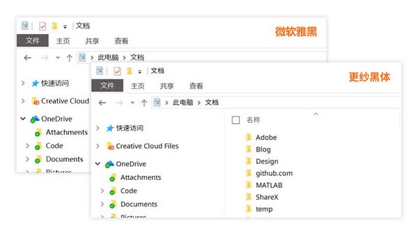 圖是一個(gè)對(duì)比,不過因?yàn)殡娔X是 2K 分辨率的屏幕,其對(duì)比并沒有很明顯,更多是字型上的差別,但是如果將電腦外接 1080p 分辨率的顯示器的時(shí)候,兩種字體的顯示效果差別就很是明顯了??傊喓隗w相比微軟雅黑在 100% 縮放比例下的顯示效果確實(shí)要好上一些。