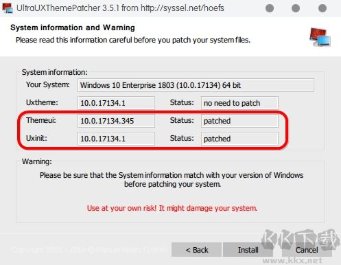 如果安裝本補丁后應用主題無效,請再次打開安裝程序,停留在破解詳情界面(如下圖),看下面紅色框內(nèi)的項是否顯示的是 patched