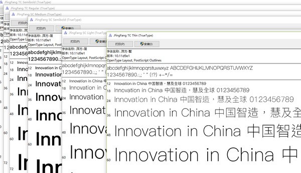 從 Mac 系統(tǒng)中提取出來(lái)的全套蘋方字體完整版包含6種粗細(xì)字體及簡(jiǎn)繁雙版本,6種字重分別是極細(xì)體、纖細(xì)體、細(xì)體、常規(guī)體、中黑體、中粗體、粗體,全部都是 .ttf 格式,Windows系統(tǒng)可直接安裝使用。