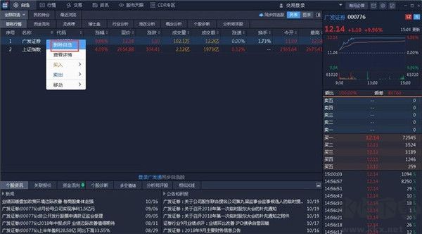 試用一下軟件的刪除自選股功能,將廣發(fā)證券從自選股列表中刪除。用鼠標(biāo)選中廣發(fā)證券,用鼠標(biāo)右鍵點擊廣發(fā)證券,然后點擊右鍵菜單中的刪除自選,就可以將選中的廣發(fā)證券自選股從自選股列表中刪除;