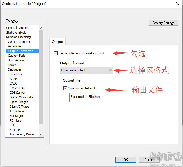 Project ->Options -> Output Coverter -> 勾選上“Generate additional output”、選擇輸出格式為“Intel extended”,再次設(shè)置輸出名稱就配置好了見下圖: