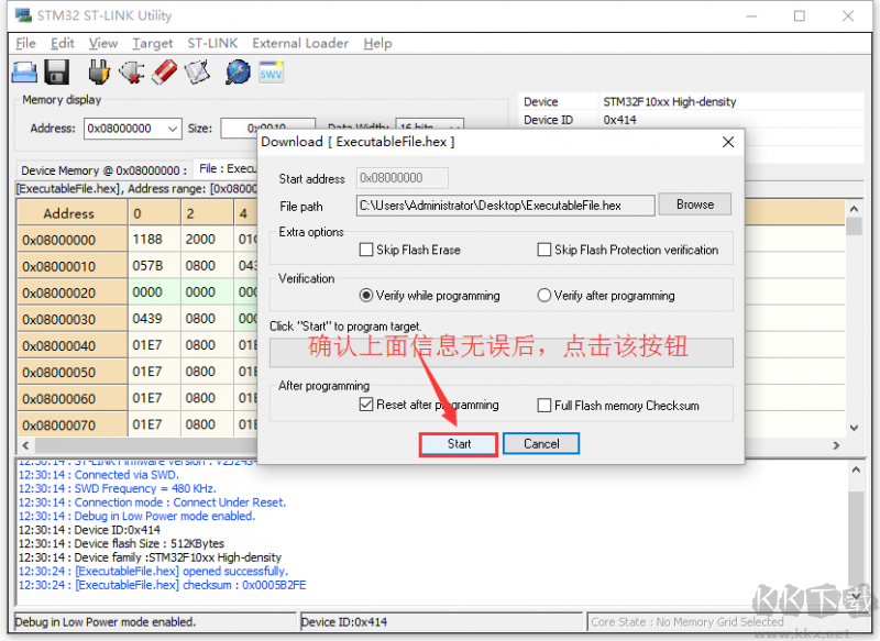 彈出信息確認(rèn)窗口,如hex文件路徑、驗(yàn)證方式等,確認(rèn)信息無誤后點(diǎn)擊“Start”開始下載程序。