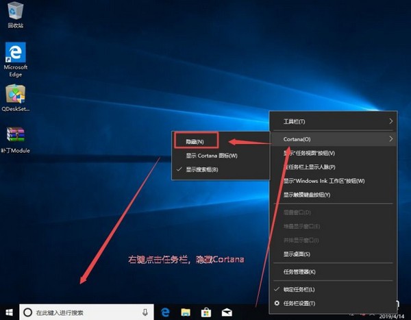 1、首先隱藏任務(wù)欄的Cortana,因?yàn)樾書桌的圖標(biāo)還是會覆蓋在cortana上,在任務(wù)欄單擊右鍵,選擇小娜,隱藏,如下圖所示:
