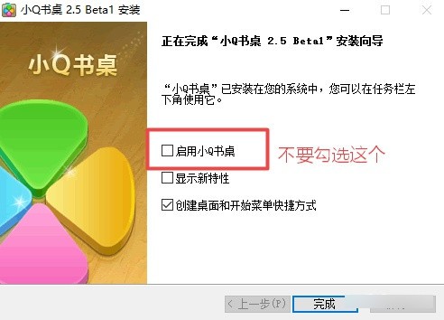 2、安裝QDeskSetup-2.5.1278.201.exe,安裝完成后不要勾選啟用小Q書桌選項(xiàng),因?yàn)橐坏﹩⒂眯書桌,就會自動加載注入模塊,導(dǎo)致待會替換注入模塊的時候提示文件正在被使用。