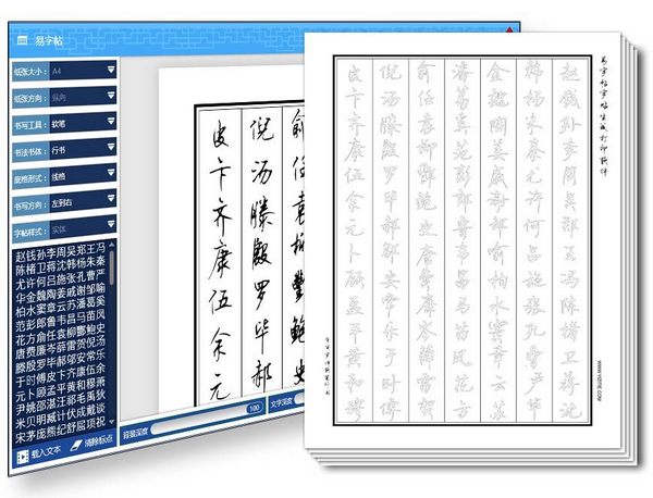 易字帖是一款支持自動生成和打印字帖的電子版字帖軟件,提供選擇行書、楷書、行楷書、隸書等多種不同的書法字體。主要功能就是生成、打印字帖,不管你是拿來自己練字還是分享給好朋友都是可以的,只要你選擇好需要字帖內(nèi)容,然后就可以生成打印出來!
