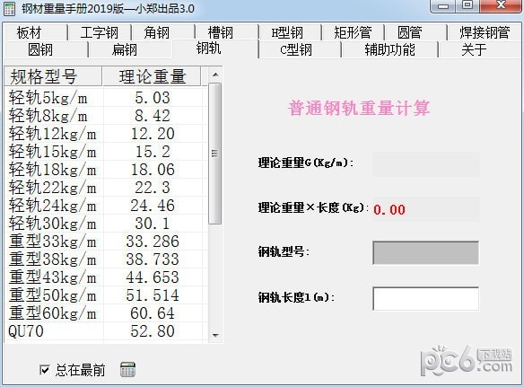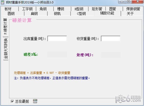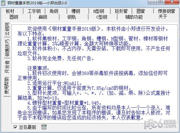 鋼材重量手冊(cè)是小鄭出品的元支持鋼板、工字鋼、角鋼、槽鋼、H型鋼、無(wú)縫管、鋼管、鋼軌、C型鋼理論重量的計(jì)算、磅差處理、金額大寫(xiě)轉(zhuǎn)換等功能的綠色小工具,體積小功能強(qiáng),可以用于計(jì)算查詢(xún)各種鋼材鋼截面特性,公歡迎有需要使用這款鋼材重量計(jì)算工具的用戶(hù)前來(lái)獲??!