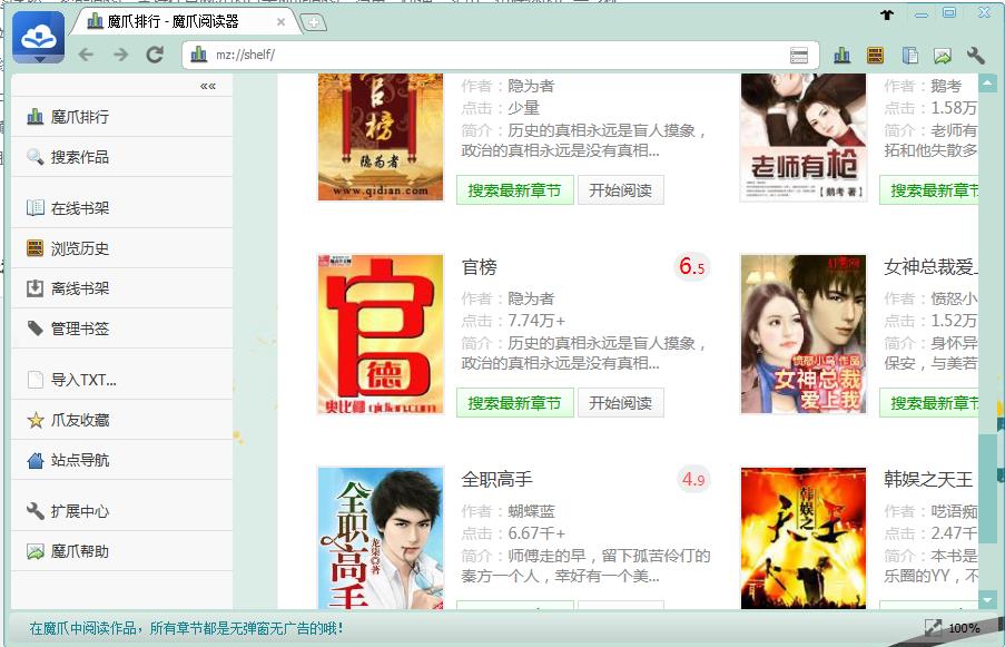 純凈的小說閱讀環(huán)境,魔爪小說下載閱讀器可以過濾任何小說網(wǎng)站的任何廣告、彈窗,還您一片最清爽的閱讀藍(lán)天!