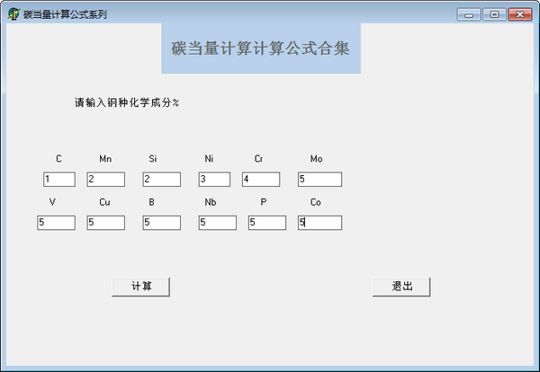 碳當(dāng)量計(jì)算公式軟件是一款根據(jù)用戶需求計(jì)算碳當(dāng)量的軟件,使用這款工具可以幫助用戶輸入的鋼種化學(xué)成分百分比,使用該工具輕松的算出碳當(dāng)量,還可以并根據(jù)碳當(dāng)量的國際要求進(jìn)行公式比較,是一款非常方便的碳當(dāng)量計(jì)算軟件!