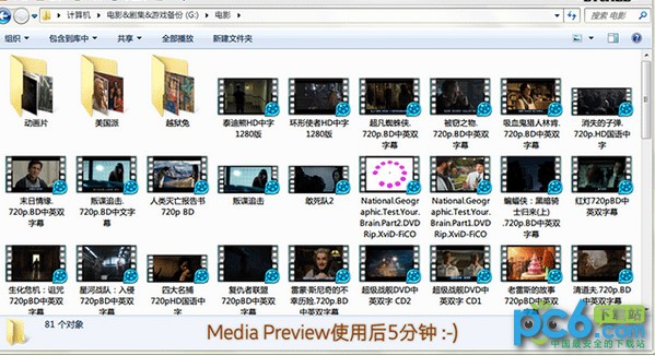 Media Preview是一款功能強大的Windows視頻快速預(yù)覽插件,該插件可以截取視頻中的精彩畫面,將其作為視頻預(yù)覽畫面顯示,讓用戶無需打開視頻就可以直接判斷視頻中的大致內(nèi)容。相比起Windows系統(tǒng)默認(rèn)的只能夠顯示黑屏的預(yù)覽功能,Media Preview無疑更加符合我們的需求。KK下載站為您提供Media Preview 中文綠色版下載,有需要的朋友趕緊下載使用吧!