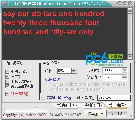 數(shù)字翻譯器是可以將阿拉伯?dāng)?shù)字轉(zhuǎn)換成英文的一款實用工具,軟件可以參照商務(wù)英語慣用方式,可以生成標(biāo)準(zhǔn)的英文金額,功能非常的實用。KK下載站為您提供數(shù)字翻譯器 綠色版下載,有需要的朋友可以下載使用哦!
