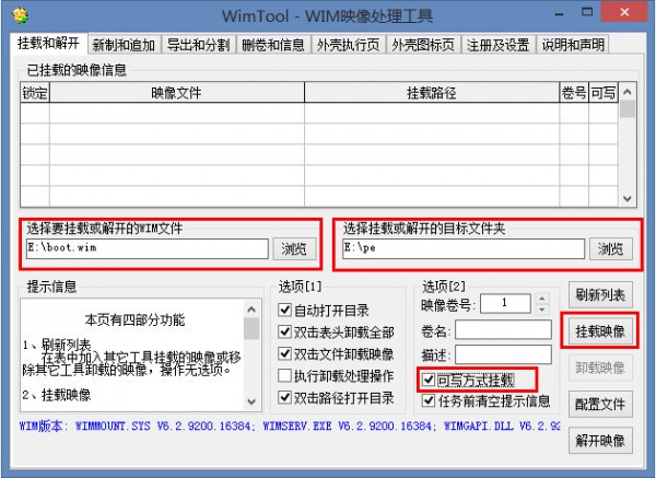 2、掛載映像必選項(xiàng)有映像文件名、目標(biāo)目錄、映像號(hào),可改寫(xiě)掛載是可選項(xiàng)。