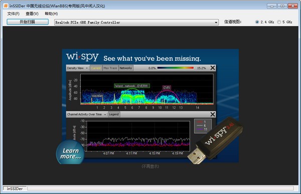 inSSIDer是MetaGeek公司推出的一款全球知名的WiFi網(wǎng)絡(luò)搜索軟件,它不僅能夠幫助用戶搜索到無(wú)線設(shè)備所處范圍內(nèi)所有的WiFi熱點(diǎn),還能告知用戶這些熱點(diǎn)的基本信息、信號(hào)強(qiáng)度以及信道占用情況等。此外,它還擁有一項(xiàng)超前的功能,即支持2.4GHz和5GHz雙頻段搜索。