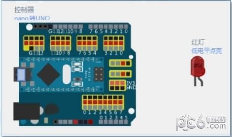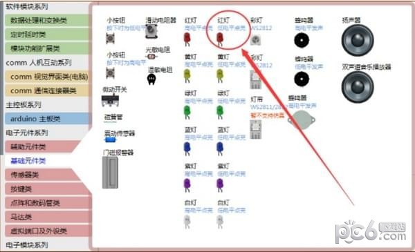 指示燈模塊在電子元件系列里邊的基礎元件類,共有紅黃綠藍紫和白等6種顏色的指示燈,選擇一個指定顏色的燈,鼠標左鍵點擊可以添加到編程界面中
