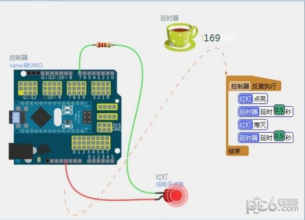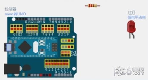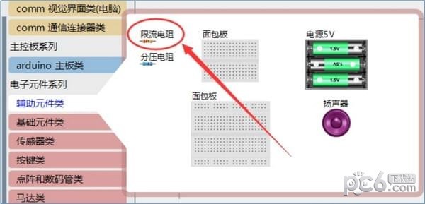 LED指示燈不能直接連接到主板上,需要通過一個限流電阻降低電流。限流電阻在電子元件系列里邊的輔助元件類,共有限流電阻和分壓電阻兩種。鼠標左鍵點擊可以添加到編程界面中