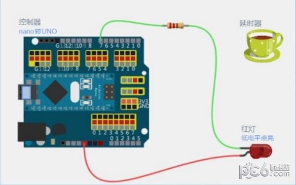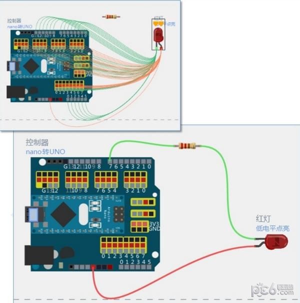 指示燈模塊拖進來后我們需要把它和主控板連接起來。鼠標放到指示燈模塊的端口上,界面會給出提示線條,根據提示線條任意連接即可。