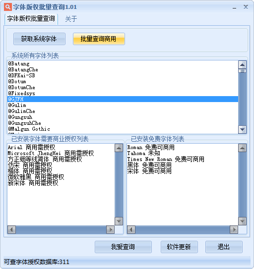 字體版權批量查詢是一款用來查詢電腦中所有字體是否有版權的一款查詢工具,就是說是否支持商用,通過這款字體版權能快速查詢電腦中字體能否用來商用,對于設計師來說字體不能亂用,否則會被告侵權,所以自查是很有必要的,歡迎需要查詢字體版權的用戶前來獲取這款字體版權批量查詢。