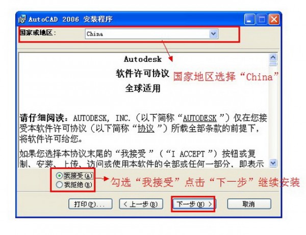 國(guó)家地區(qū)選擇“China”勾選“我接受”點(diǎn)擊“下一步”繼續(xù)安裝 如圖四。