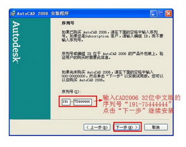 CAD2006 32位中文版的序列號(hào)“191-75444444” 輸入正確后點(diǎn)擊“下一步”繼續(xù)操作 如圖五。