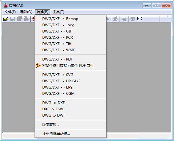 快捷CAD不僅是一款非常好用的dwg文件查看器還是dwg/dxf文件轉(zhuǎn)化器。 可以將dwg文件和dxf文件轉(zhuǎn)化成bitmap、jpeg、gif、pcx、tiff、wmf、pdf、svg、eps、cgm等格式文件。 直接點(diǎn)擊轉(zhuǎn)換然后選擇相應(yīng)的格式即可。 *導(dǎo)出保留圖層信息和光柵的PDF文件 *文字的字體和顏色確認(rèn)為正確的實(shí)體 *同時(shí)支持多個(gè)文件的格式批量轉(zhuǎn)換 *支持DWG和DXF和DWFtosave格式