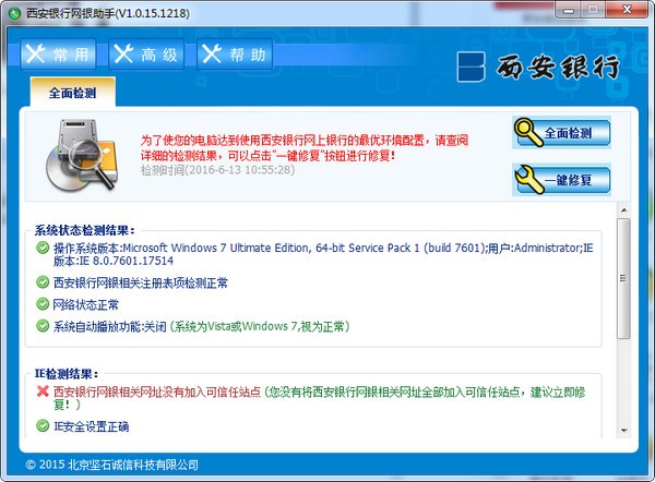 切換到【常用】主界面一鍵檢測修復(fù)即可讓電腦可以正常訪問西安銀行網(wǎng)上銀行了!