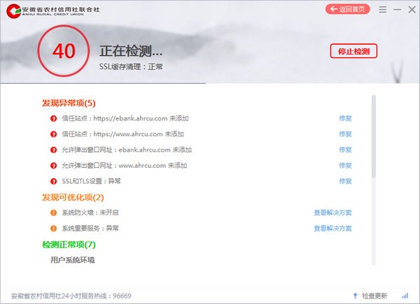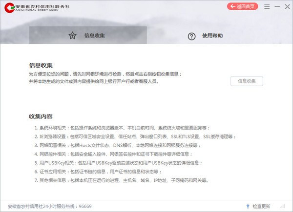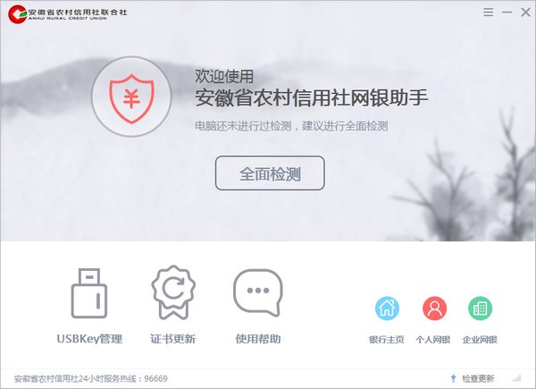 安徽省信用社網銀助手是針對安徽省農村信用社用戶所使用的一款網銀助手工具,是由安徽省農村信用社聯合社打造的電腦環(huán)境一鍵修復軟件。只需一鍵修復所需要的安裝的控件與驅動,即可讓我們在電腦上進行放心的網銀交易,更安全。