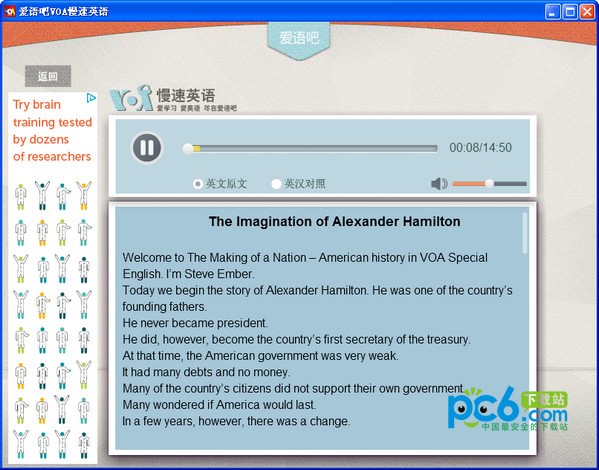 VOA慢速英語電腦版又叫VOA Special English,是美國之音為全世界英語愛好者所推出的對定節(jié)目—慢速英語節(jié)目,針對英語水平較差者練習聽力和閱讀水平的用戶設計,讓你愛學習,愛英語,邊聽邊學!