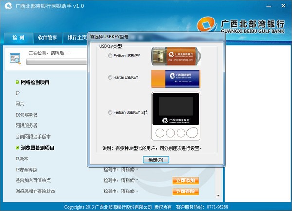 廣西北部灣銀行推出的網(wǎng)上銀行客戶端配置工具。通過網(wǎng)銀助手可引導您完成整個網(wǎng)上銀行所需控件、驅(qū)動程序的安裝,使您更加方便快捷地使用我行網(wǎng)銀。 對于已經(jīng)安裝的軟件,如果有新的版本,網(wǎng)銀助手也將提醒您更新,以達到使用網(wǎng)銀所需的最優(yōu)環(huán)境。該軟件能檢測您的電腦環(huán)境,一鍵修復驅(qū)動;且還可以自動配置網(wǎng)銀信任站點、安裝網(wǎng)銀控件等相關(guān)問題。讓你更加輕松安全的訪問網(wǎng)銀!