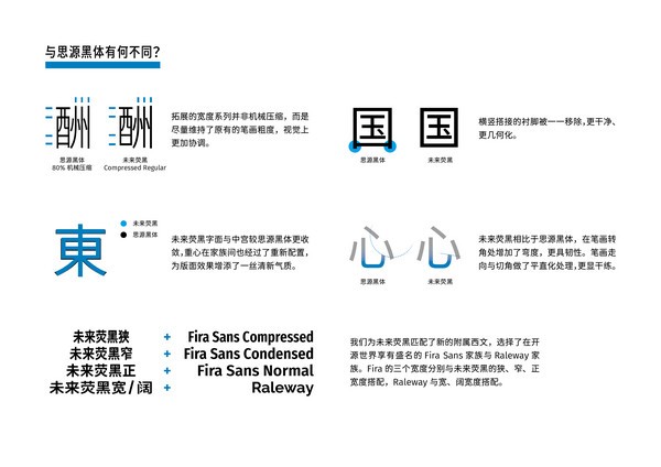 A: 不是。未來(lái)熒黑是通過(guò)在思源黑體上形變來(lái)改變字形形態(tài)、拓展家族的,思源黑體沒(méi)有發(fā)布可變版本,我們也無(wú)從恢復(fù)其母版數(shù)據(jù)。但是不排除在未來(lái)有封裝成有寬度軸的可變字體的可能性。你可以玩一玩我們的demo,來(lái)更加直觀地看到形變是如何實(shí)現(xiàn)的。