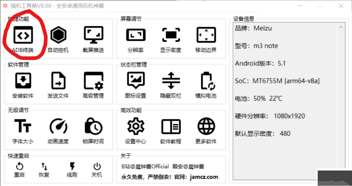 第四步,應(yīng)該可以進入主界面了,否則會提示找不到設(shè)備,而自動關(guān)閉程序。例如我的魅族flyme,USB調(diào)試路徑則在設(shè)置——輔助功能——開發(fā)者選項里面。不同的手機的路徑不一樣,但是都可以通過連續(xù)點擊系統(tǒng)版本號打開開發(fā)者選項的入口。