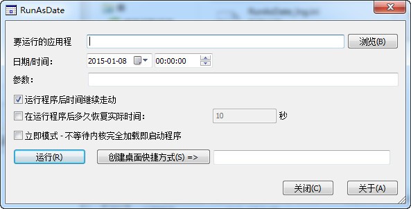 RunAsDate是一款非常強(qiáng)大的用來(lái)突破一些軟件時(shí)間限制的小工具,使用簡(jiǎn)單,支持建立運(yùn)行在特定日期時(shí)間的快捷方式,便于以后使用。通過(guò)RunAsDate更改指定軟件的時(shí)間,那么我們就可以使用任何具有使用時(shí)間限制的軟件。