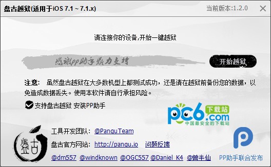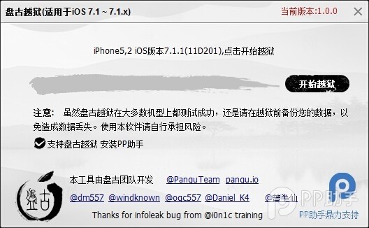 盤古越獄工具這款越獄工具支持iOS 7.1-7.1.2,建議最好升級(jí)到iOS 7.1.1,支持ipad 2、iPad 3、iPad 4、iPad Air、iPad mini、iPad mini 2、iPhone 4、iPhone 4S、iPhone 5、iPhone 5C、iPhone 5S、iPod Touch 5設(shè)備的越獄,有需要使用盤古越獄的的用戶快來獲取吧!