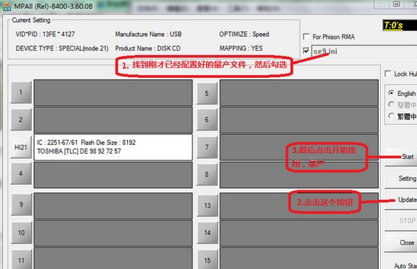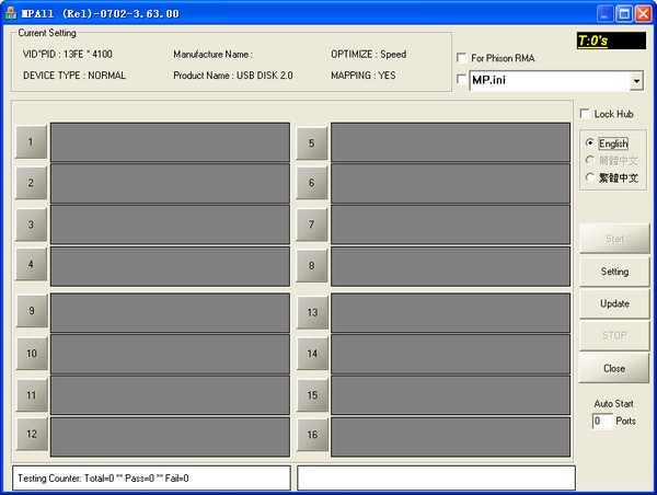 然后打開量產工具MPALL_F1_0702_v363_00.exe,進入如下界面準備量產;
