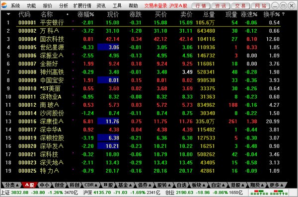菜單欄位于系統(tǒng)圖片的左上角,包括系統(tǒng)、功能、報價、分析、信息、香港股票期貨、工具、幫助等八個欄目。同時,按下Alt和菜單旁邊的字母,彈出下拉列表,按下相應(yīng)的字母鍵選擇功能。