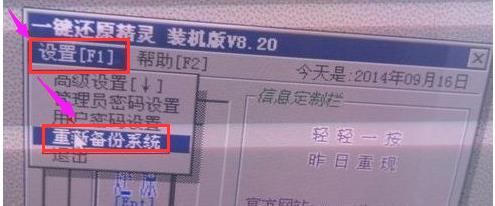 3、點(diǎn)擊“設(shè)置”,在打開的菜單中,選擇“重新備份系統(tǒng)”