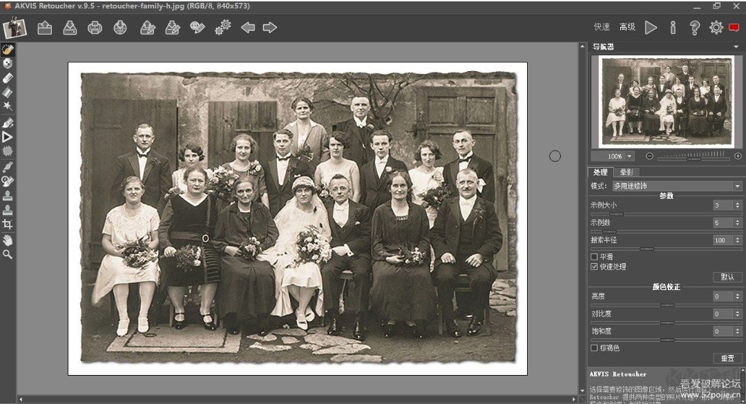AKVIS Retoucher中文版是一款可以修復老照片的軟件,他不需要你多高超的PS及圖片處理技術(shù),使用AKVIS Retoucher可以很簡單的完成修復,不僅可以去除老照片上的雜質(zhì),劃痕,污漬等缺陷出現(xiàn)損壞的照片,還能重建圖片缺失的部分。這個工作都是自動完成的,堪稱傻瓜式!