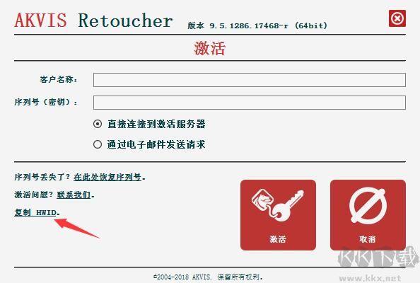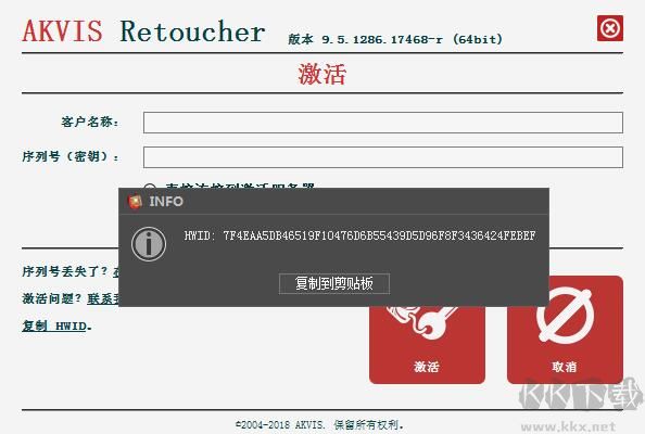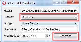 4.打開kg.exe,粘貼HWID到注冊機,選擇對應軟件(Retoucher),點擊Generate按鈕。