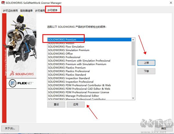 10、運行軟件,依次打開幫助> SolidNetWork License Manager >許可順序,將Premium產(chǎn)品移動到Professional和Standard之上,點擊應(yīng)用并確定,重新啟動;