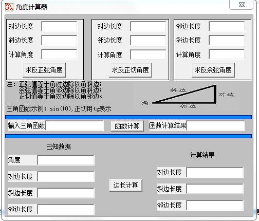 角度計算器提供了角度計算,三角函數(shù)計算等功能,可以計算求反正弦角度、求反正切角度、求反余弦角度,你只需要輸入三角形的邊長就可以點擊計算,這樣您就可以知道三角形的角度了,雖然計算三角形角度以及三角函數(shù)是有公式的,但是在計算一些不是整數(shù)角度的時候就比較困難,例如計算55度、計算89度等對應(yīng)的函數(shù)值,使用公式計算就很復(fù)雜,所以小編找到了這款三角函數(shù)角度計算器,可以解決一切復(fù)雜角度計算!