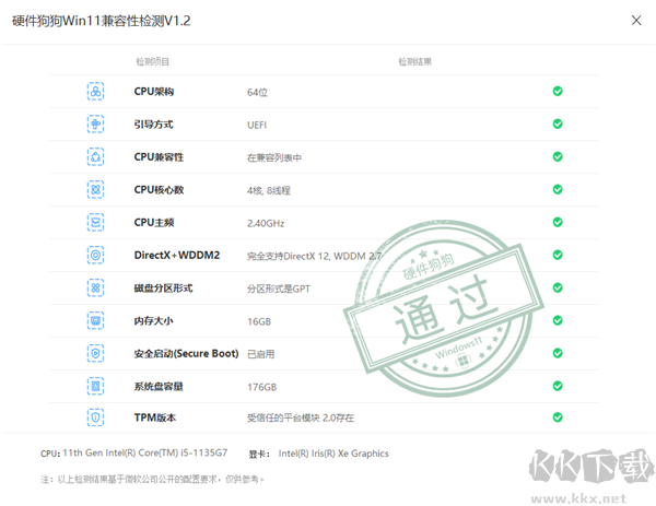 硬件狗狗新版增加了兩個Windows 11小工具,都在工具箱板塊,一是硬件兼容性檢測工具,會從多個角度進行檢測,包括CPU、顯卡、硬盤、內(nèi)存等硬件規(guī)格,引導(dǎo)方式、硬盤分區(qū)、安全啟動(Secure Boot)、TPM版本等系統(tǒng)配置。