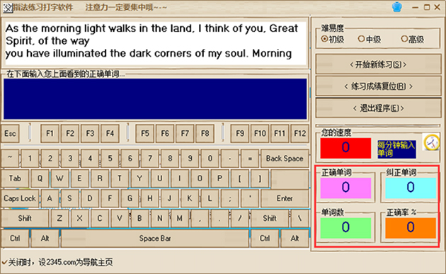 3、在指法練習(xí)打字軟件界面的右下角,會實時顯示您的打字練習(xí)相關(guān)數(shù)據(jù),包括打字速度、正確率等,對結(jié)果滿意的話您就可以試著調(diào)高難度了,快來試試吧。