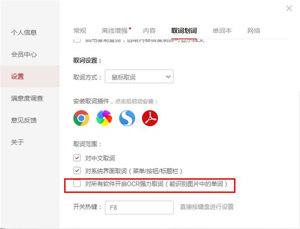 2、進(jìn)入“軟件設(shè)置”后,選擇“取詞劃詞”,在“取詞劃詞”的選項(xiàng)中有一個(gè)“開啟OCR強(qiáng)力取詞”的選項(xiàng),單擊進(jìn)行下載。