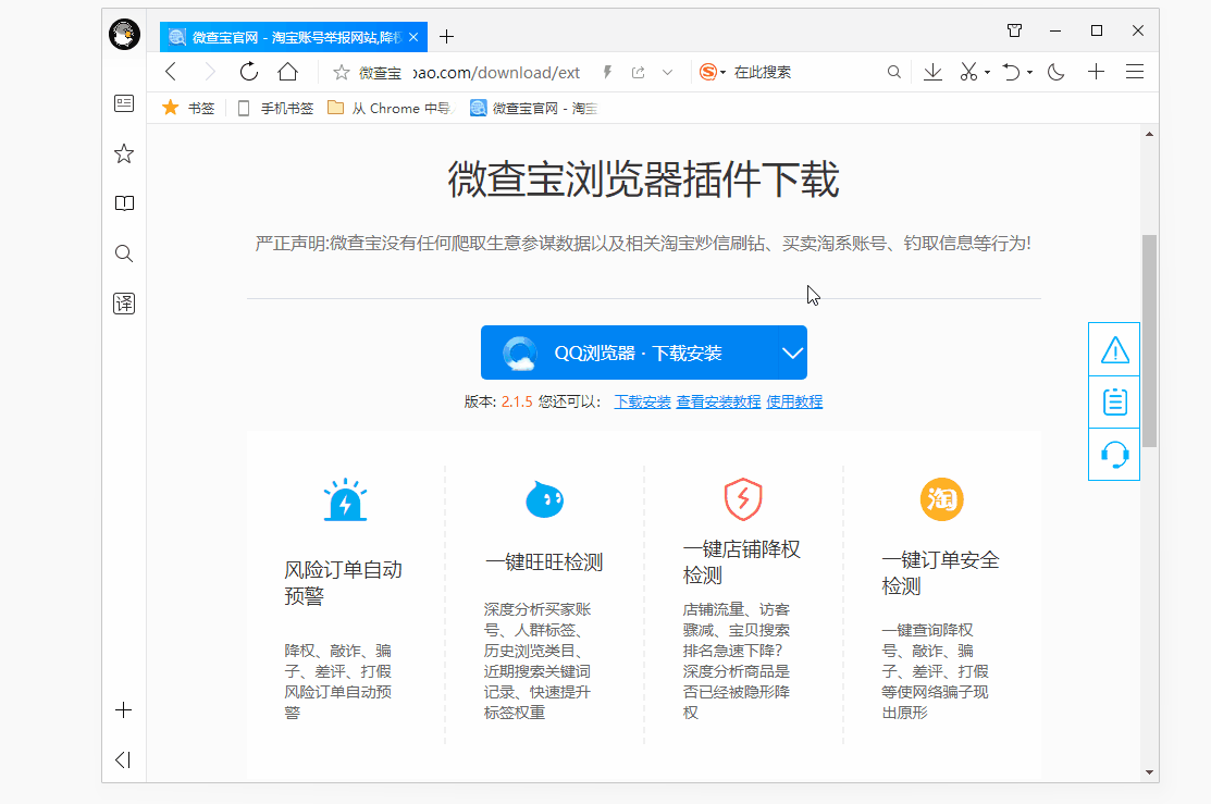 微查寶照妖鏡是一款專(zhuān)門(mén)為賣(mài)家設(shè)計(jì)的甄別買(mǎi)家信譽(yù)的瀏覽器插件,史需要在瀏覽器上安裝該插件就可以標(biāo)識(shí)用戶(hù)!甄別用戶(hù)的購(gòu)買(mǎi)行為,功能識(shí)別主要分為惡意打假、抽檢、黑號(hào)、愛(ài)給差評(píng)、惡意退款、降權(quán)、違規(guī)等。一旦被納入微查寶的買(mǎi)家征信平臺(tái),賣(mài)家在銷(xiāo)售推廣產(chǎn)品的時(shí)候就可以識(shí)別哪些買(mǎi)家是不是真心買(mǎi)家,避免給賣(mài)家造成名譽(yù)上的損失。該工具安裝使用都非常簡(jiǎn)單!主流瀏覽器都可以安裝!可幫助你的店鋪規(guī)避一些風(fēng)險(xiǎn)。