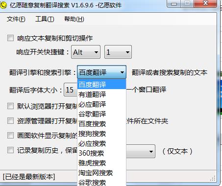億愿隨意復制翻譯搜索工具是一款在線翻譯工具,當你復制文本(中文或英文)之后按下ALT+1就可以快速打開搜索引擎,支持百度翻譯、谷歌翻譯、有道翻譯,必應翻譯,百度搜索、搜狗搜索、360搜索等,有時使用它可以很方便的進行翻譯、資料查詢等操作。